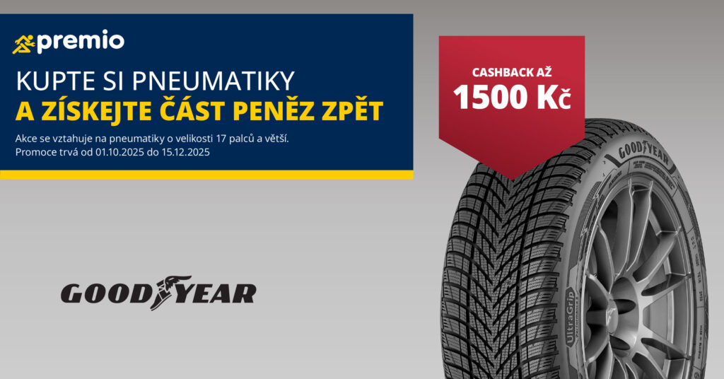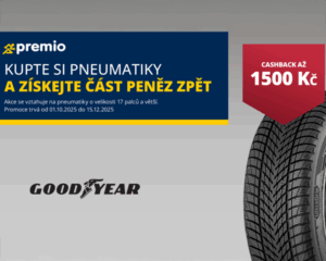 - Kupte si kvalitní pneumatiky Goodyear a získejte část peněz zpětZa nákup 4 kusů pneumatik zimních/celoročních značky GOODYEAR ve velikostech 17, 18 nebo 19 palců a vyšší včetně montáže. Akce platí od 1.10.2025 do 15.12.2025, registrace účtenek do 31.12.2025. Více na Pneumatiky – Pneuservis TRANSDEV (www.premio.transdev.cz)